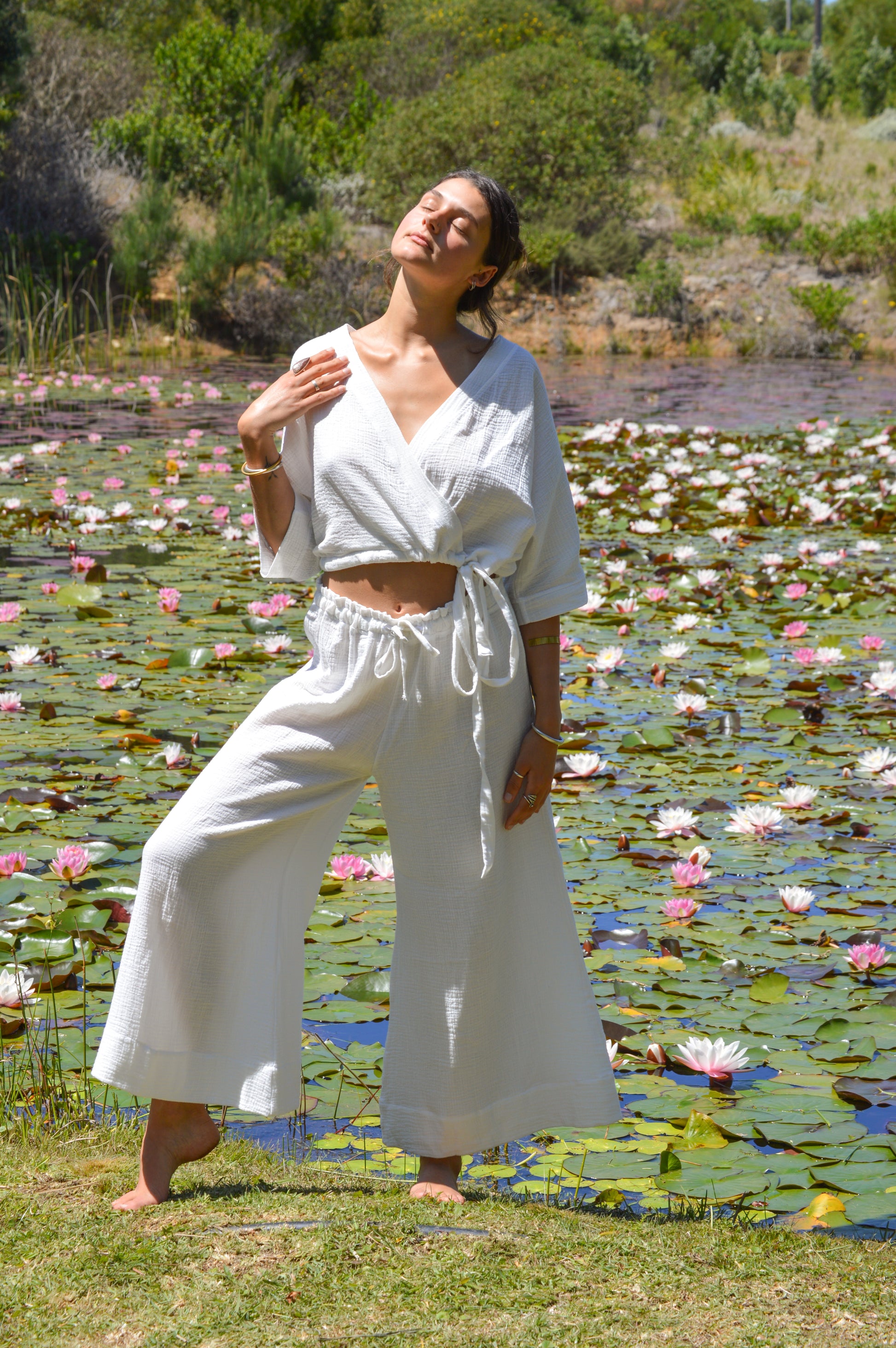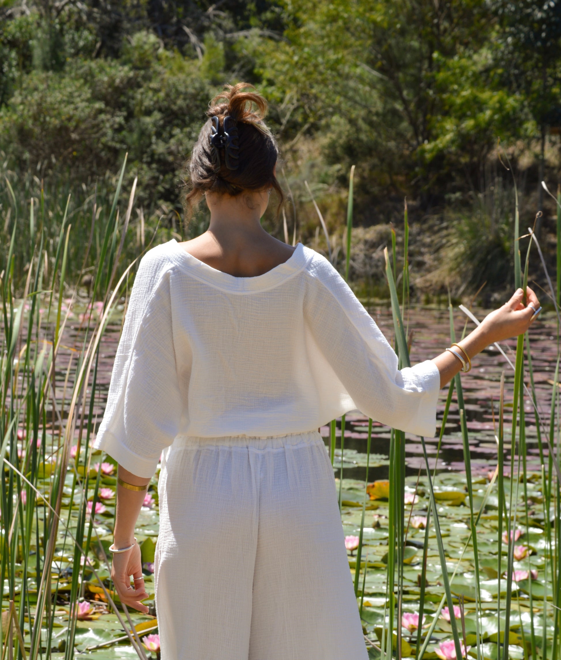 Made from 100% cotton gauze, this top is exceptionally soft, lightweight, and breathable, like feeling a gentle breeze while wrapped in the warmth of a floating cloud. Whether you're flowing through a yoga sequence or taking a slow morning to yourself, this piece moves with you and makes space for stillness too.